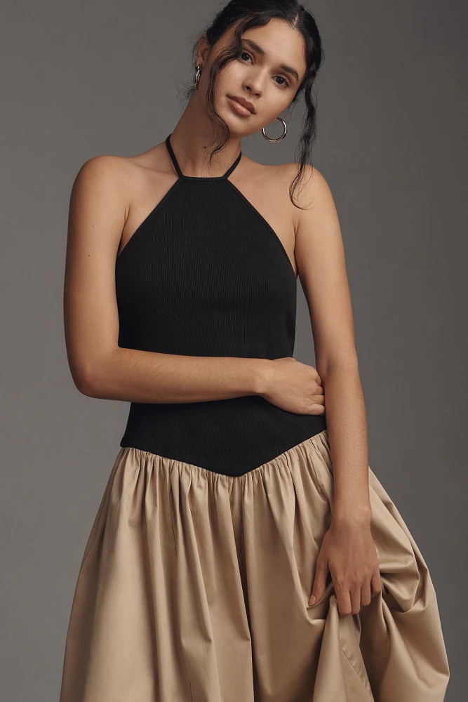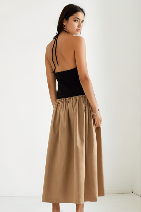 The Emma dress is a fun mix of chic and playful! The sleek black halter-neck bodice hugs the torso, while the gathered beige midi skirt adds a breezy, twirl-worthy touch. The contrast between structured and flowy makes it perfect for brunch, a stroll, or a night out. Pair it with colorful accessories or strappy sandals for extra charm!