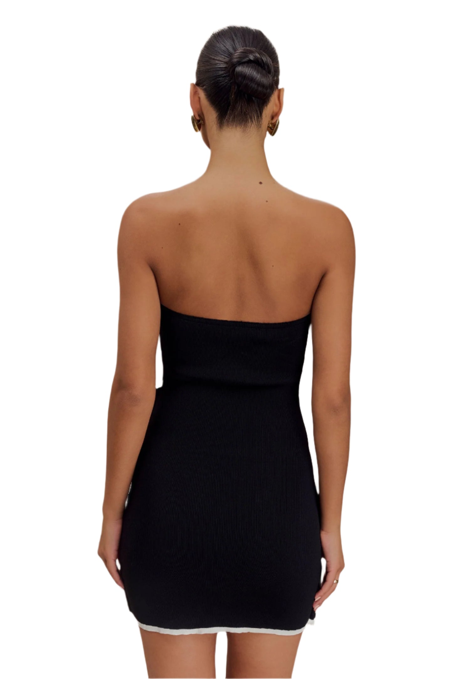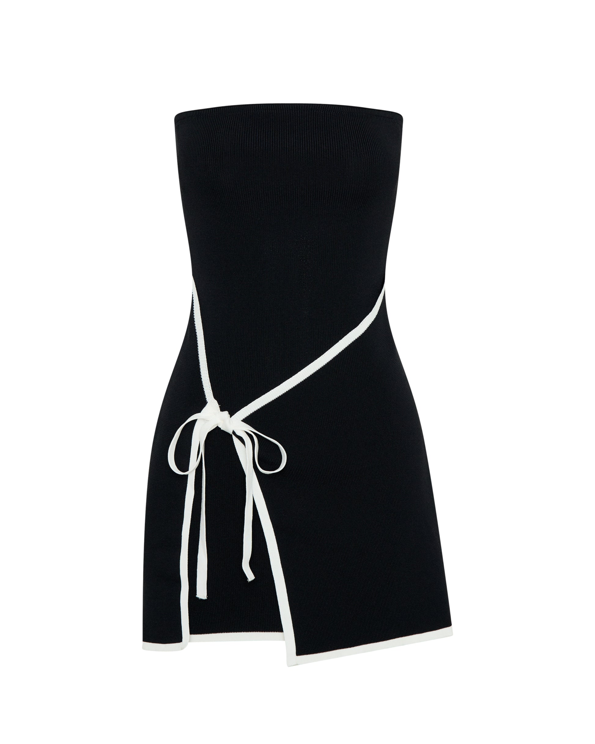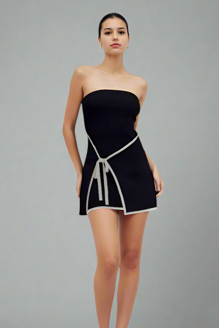 This sleek, strapless black dress features a fitted bodice that transitions into a modern, asymmetrical skirt. A distinctive white ribbon detail wraps around the waist, tying into a subtle bow, adding a touch of elegance and structure. Crafted from a Luxurious Lycra fabric, the dress offers a form-flattering silhouette and a contemporary edge, perfect for casual or semi-formal occasions. Paired with minimalist earrings, it exudes a sophisticated yet understated style.